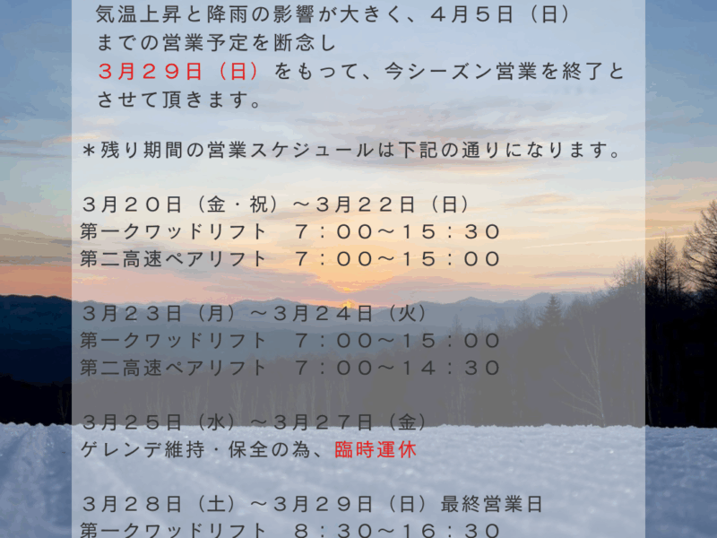 開田高原マイアスキー場の営業は3月29日までとなりました。小雪シーズン、色々あったけど全国的にスキー場のシーズン終了が多い中、3月いっぱいなら上出来ですね。連休まで持ってとりあえずほっとはしています。