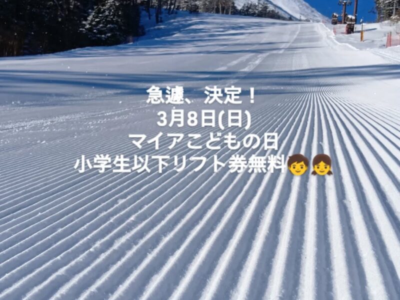 【緊急告知】3月8日(日)は小学生以下 リフト料金無料!さらに…3月15日(日)は「スキーこどもの日」こちらも 小学生以下 リフト料金無料 になります。春スキーシーズン、ぜひご家族でお楽しみください。 …