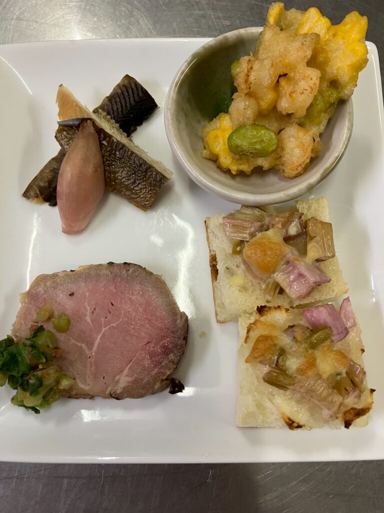 写真右下のオードブルは自家培養酵母を使ったフォカッチャにすんきをアリオリソースに絡めてチーズをのせて焼いたもの。