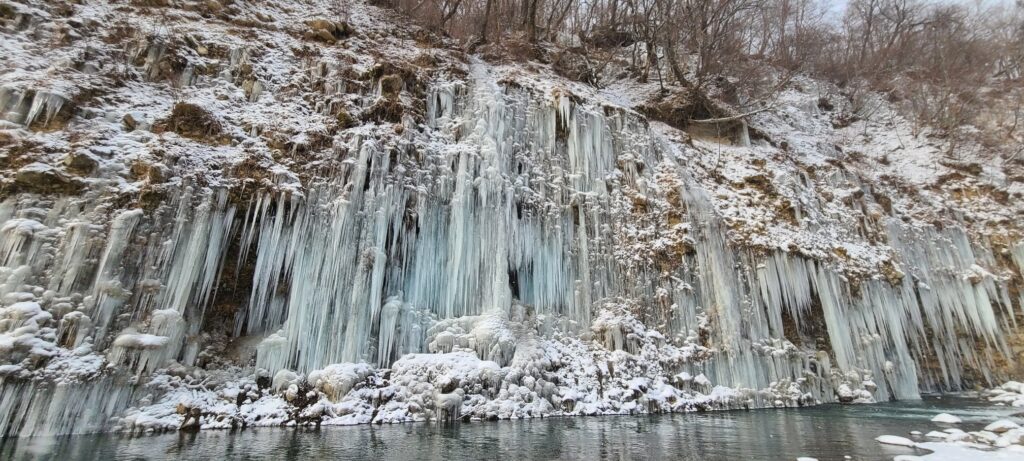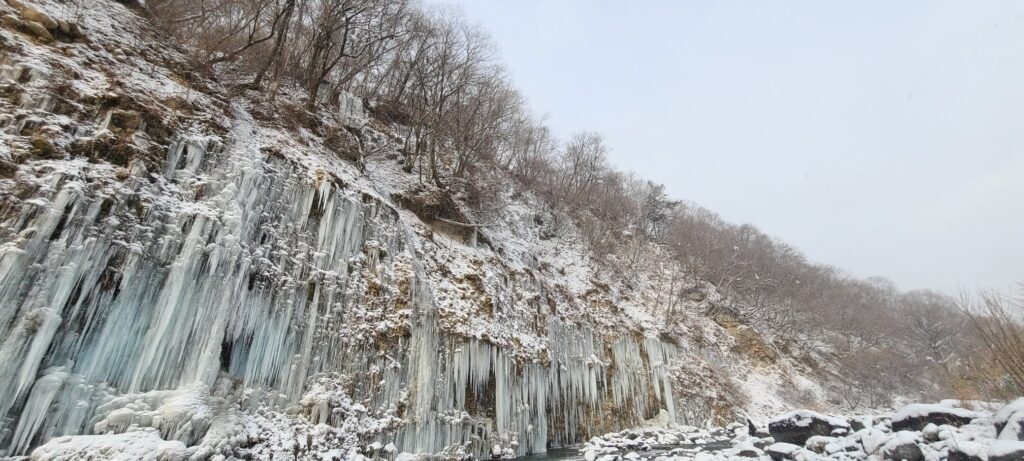 近年、話題になっているおすすめスポット。白川氷柱群。1月24日現在の写真がこちらです(お客様からのいただきものです)。雪降りでより幻想的な景色になっています。厳しい寒さの中で湧き水や斜面の水が凍りつき、高さ数10メートルにもなる氷柱が連なって現れます。厳冬期1月から2月頃が最も見頃で、夜間にライトアップされることもあります。ロッジ上天気から自動車で15分くらいです。#木曽町 #開田高原 #ロッジ上天気 #御嶽山 #木曽 #御嶽登山 #開田高原マイアスキー場 #木曽福島スキー場 #御嶽スキー場 #白川氷柱群 #白川氷柱群ライトアップ