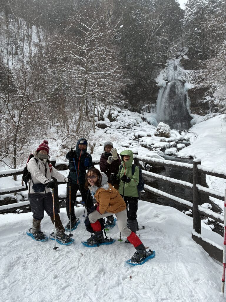 滝周辺では、偵察時よりも水しぶきが凍りつき、巨大なつららもあり迫力あり、参加者の皆さんから感嘆の声が上がっていました。寒さは厳しかったものの、歩いている間に体はしっかり温まり、終始笑顔が絶えないツアーとなりました。ツアー終わりには常設テーブルで暖かな飲み物とおやつで一息。寒冷なコンディションだからこそ出会えた景色と体験に、皆さん大変満足していただけた一日でした。