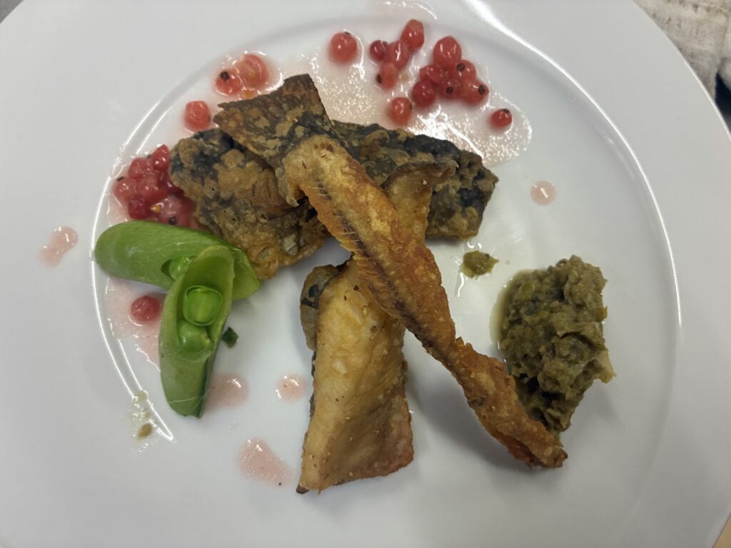 イワナのムニエル、ふきのとうのタプナードソースとふさすぐりのソースです。ふきのとうもふさすぐりも庭で収穫しました。ふさすぐりの爽やかな酸味をがアクセントに。