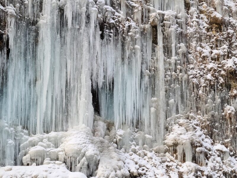 近年、話題になっているおすすめスポット。白川氷柱群。1月24日現在の写真がこちらです(お客様からのいただきものです)。雪降りでより幻想的な景色になっています。厳しい寒さの中で湧き水や斜面の水が凍りつき …